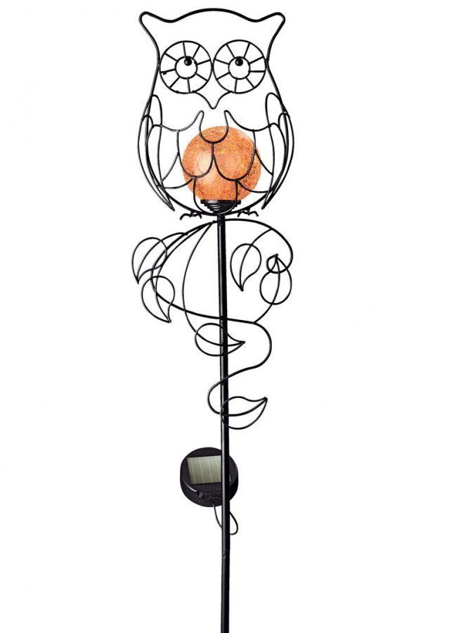 Koristeellinen aurinkokennovalaisin ’Pöllö’. Käsityötä jokainen valaisin on uniikki. Mitat (KxLxS) n. 93 x 16,5 x 10 cm. Materiaali metallia ja lasia.