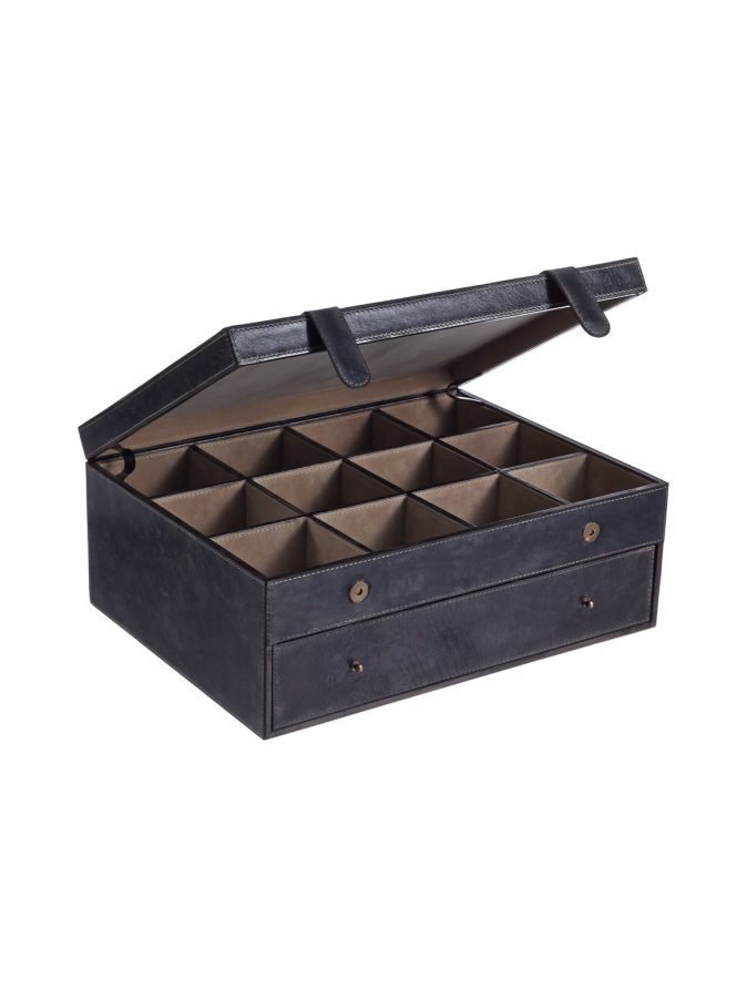 Tyylikäs säilytyslaatikko on päällystetty laadukkaalla nahalla. Esimerkiksi solmioiden säilytykseen soveltuva laatikko suljetaan magneettinapillisten nahkaremmien avulla. Kannen alla ja vetolaatikossa on yhteensä 24 lokeroa. Laatikon mitat ovat 44,5 x 33,5 x 18 cm.
