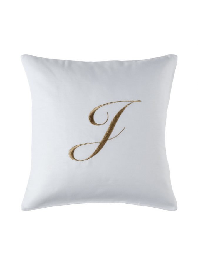 Puuvillaisessa koristetyynynpäällisessä on brodeerattu j-monogrammi.