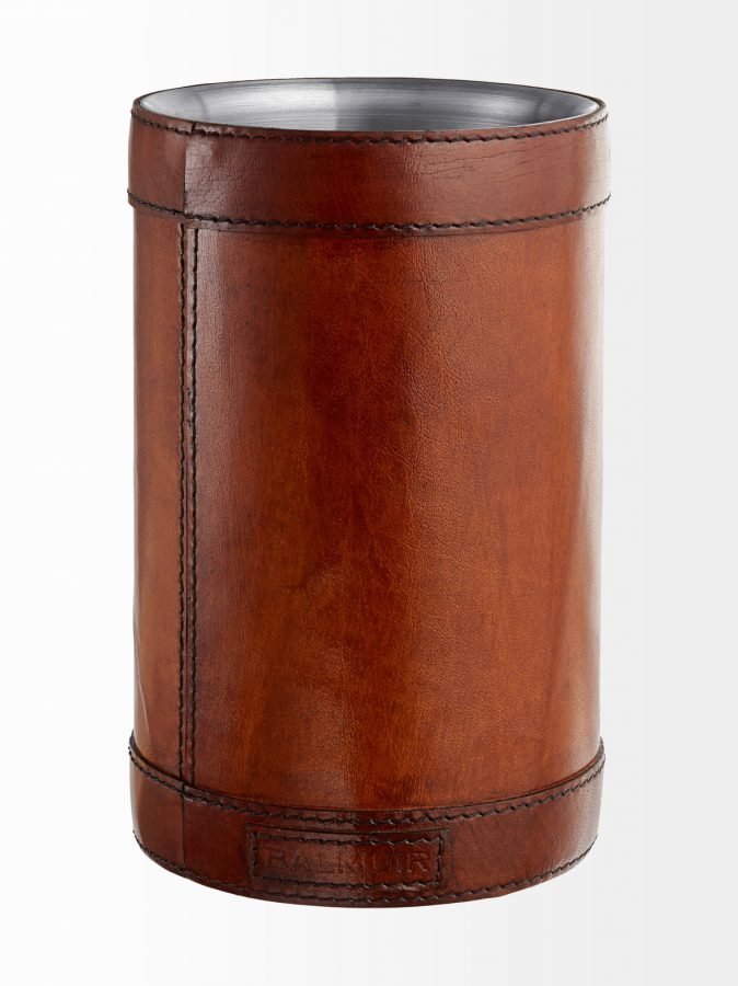 Tyylikäs viinijäähdytin on päällystetty nahalla ja sisäpuoli on metallia. Korkeus on 20 cm, halkaisija on noin 10 cm.