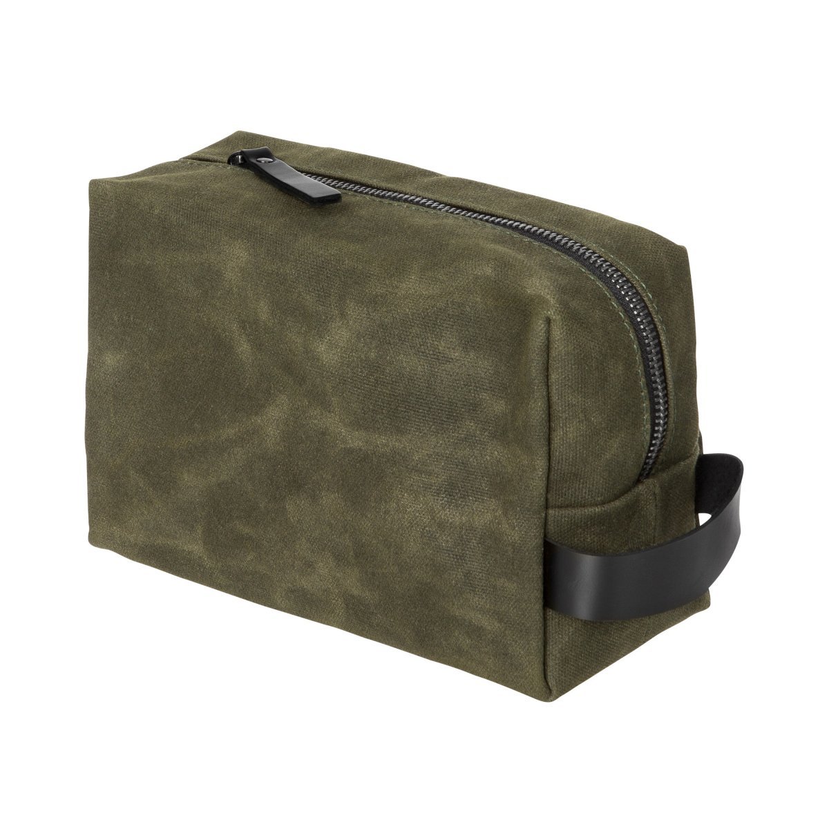 Rejäl necessär i en slitstark vaxad canvas med detaljer av läder Mått: L:21cm H:15cm D:10 Den vaxade ytan är framställd av naturligt bivax. Lädret är av ko