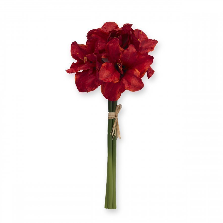 Kolmen amarylliksen kimppu. Muovia ja kangasta. Eivät kuihdu eivätkä tarvitse kastelua. Kestävät vuodesta toiseen.
