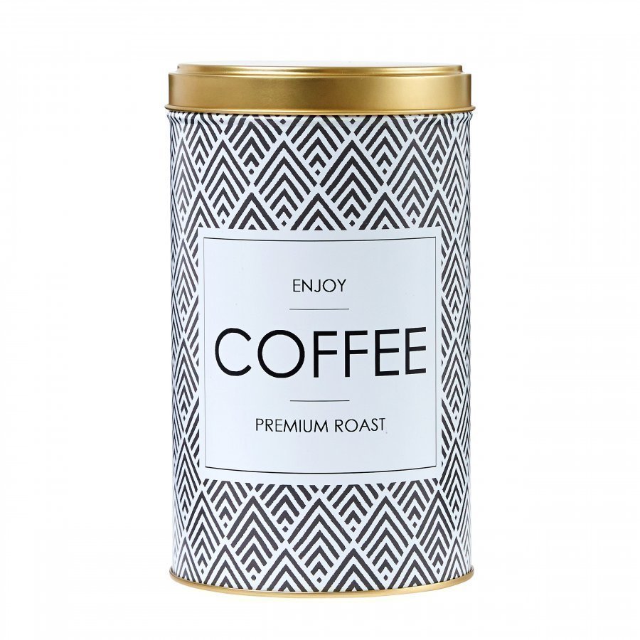 Koristeellinen peltinen purkki tekstillä ”Coffee”. Ei Konepesua.