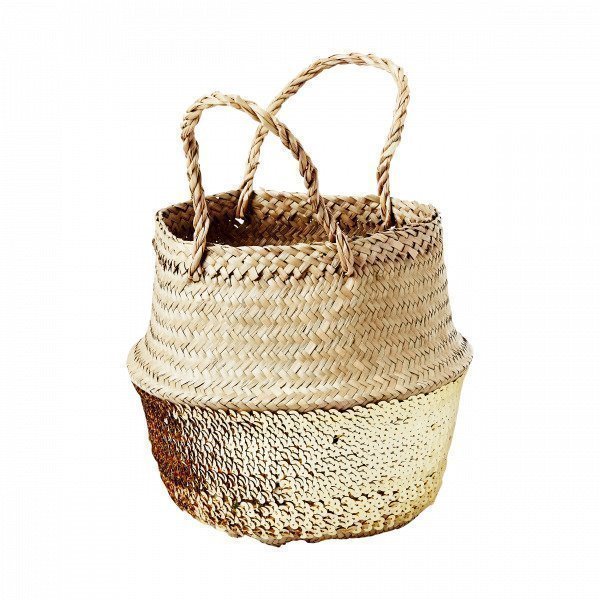 Pieni pyöreä meriheinäkori, jossa koristeena paljetteja. Korin voi taittaa sisään puolivälistä.