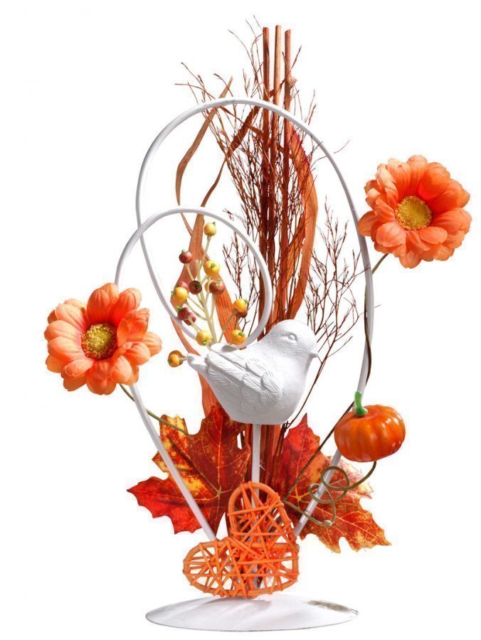 Syksyinen koristeasetelma. Keskipisteenä soma lintu. Somisteena koristekukkia. Materiaali metallia, polyesteriä, rottinkia, terrakottaa ja muovia. Mitat (KxL) n. 26 x 14 cm.