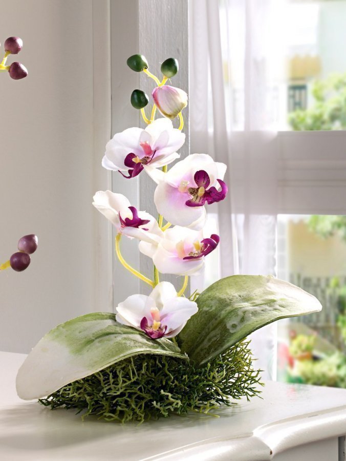 Sammaleelle asetellut orkideat. Materiaali muovia. Mitat (KxLxS) n. 27 x 19 x 23 cm.