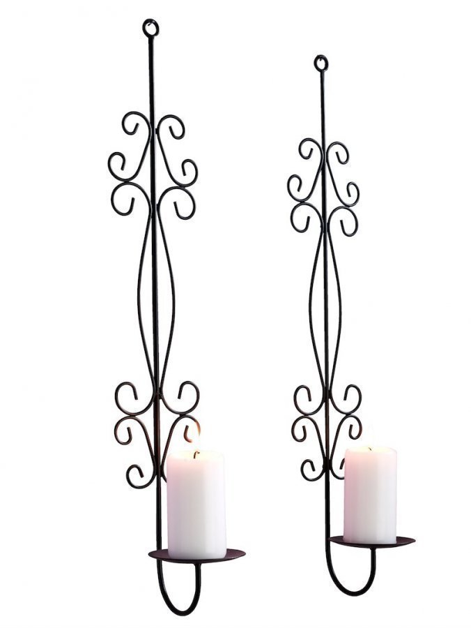 2 kpl:n setti kauniisti koristeltuja seinäkynttilänpidikkeitä. Materiaali rautaa. Toimitetaan ilman kynttilöitä. K/L/S n. 53/10/12 cm.