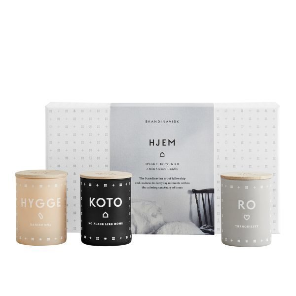 Skandinaviskin Hjem-tuoksukynttiläsettiin kuuluu kolme pientä tuoksukynttilää: Hygge (tee, mansikkakakku, villiminttu ja ruusun terälehdet), Ro (tuore ruoho, kuivuneet lehdet, hiekkadyynit) ja Koto (meripihka, jasmiini, mandariini ja vanilja)Skandinaviskin pienet tuoksukynttilät tuovat kotiin uniikkeja, Skandinavian luonnon, vuodenaikojen, kaupunkien ja perinteiden inspiroimia tuoksuja. Kynttilät on valettu pelkistettyihin laseihin, joiden pintaa koristaa viehättävä kuviointi, ja ne palavat jopa 16 tunnin ajan. Skandinaviskin tuoksukynttilät ovat toivottuja sisustusesineitä, jotka miellyttävät useita aisteja.