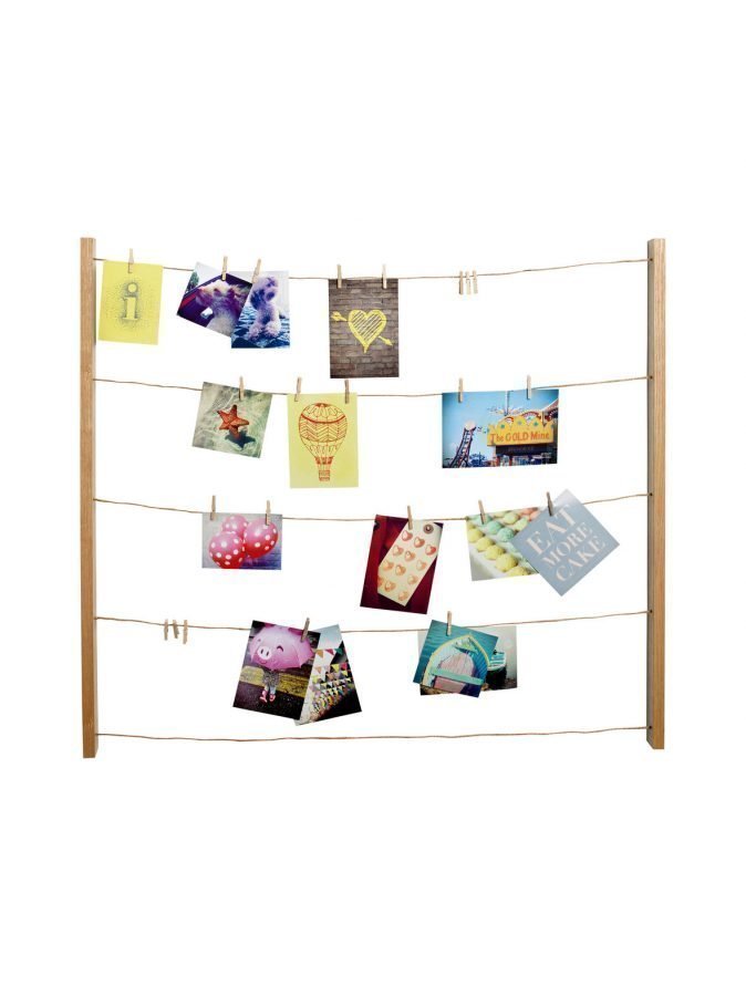Monipuolisessa valokuvakehyksessä on viisi narua ja 40 kappaletta klipsejä, joilla valokuvia, muistilappuja ja muita muistoja voi kiinnittää naruihin. Kehyksen voi laittaa siten, että narut ovat vaaka- tai pystysuorassa. Design Sung Wook Park ja Paul Loebach. Mitat ovat 75,9 x 66,1 x 3,8 cm.